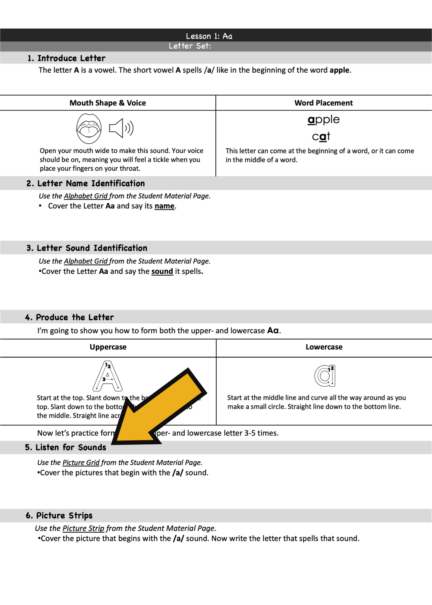 This lesson teaches the letter Aa and its sound. Children learn how to produce the sound, identify words with the sound, and write the letter that spells the sound. Sound awareness and phonics activities are aligned to increase the learning effectiveness. Notice how the lesson strategically progresses from sound activities done in isolation to doing an activity that combines sound awareness and phonics.